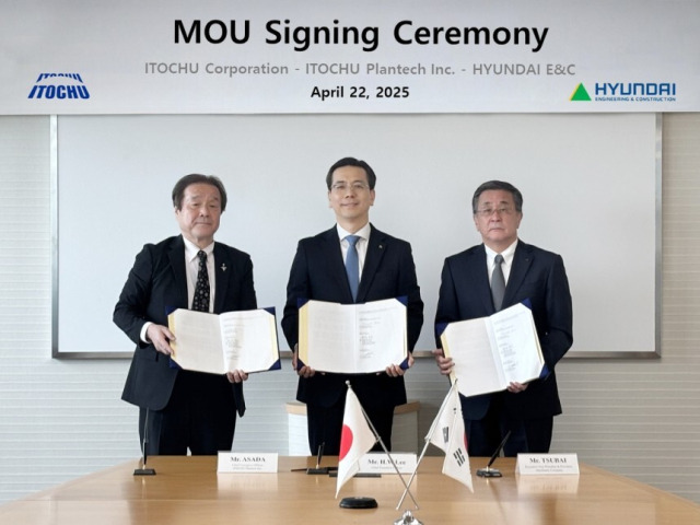 현대건설은 22일 도쿄 이토추 본사에서 이토추 및 자회사 이토추 플랜테크와 3자간 업무협약(MOU)을 체결했다고 24일 밝혔다. 협약식에는 현대건설 이한우 대표, 이토추 이시이 케이타 사장, 플랜테크 아사다 야스히코 사장 등 양측 주요 인사가 참석했다.