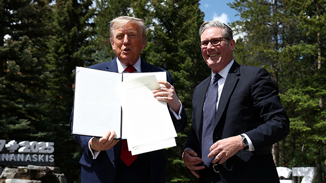 도널드 트럼프 미국 대통령이 16일(현지시간) 캐나다 앨버타주 캐내내스키스에서 열린 주요 7개국(G7) 정상회의 계기에 키어 스타머 영국 총리와 양국 간 새로운 무역협정에 공식 서명했다.